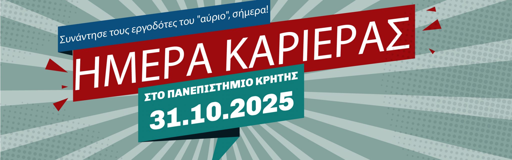 Παρακαλούμε δείτε την ανακοίνωση σχετικά με την Ημέρα Καριέρας 2025, που διοργανώνει το Πανεπιστήμιο Κρήτης στις εγκαταστάσεις του στο Ηράκλειο: https://career.uoc.gr/uoc-careerday-2025/